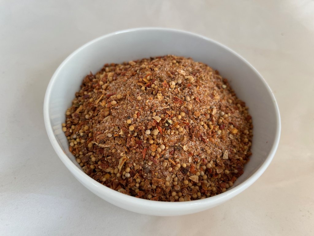 SLOŽENÍ: Sůl 30%, paprikové floky červené, HOŘČICE bílá, koriandr, cukr, maltodextrin, paprika sladká, pepř černý, kmín římský, cibule.