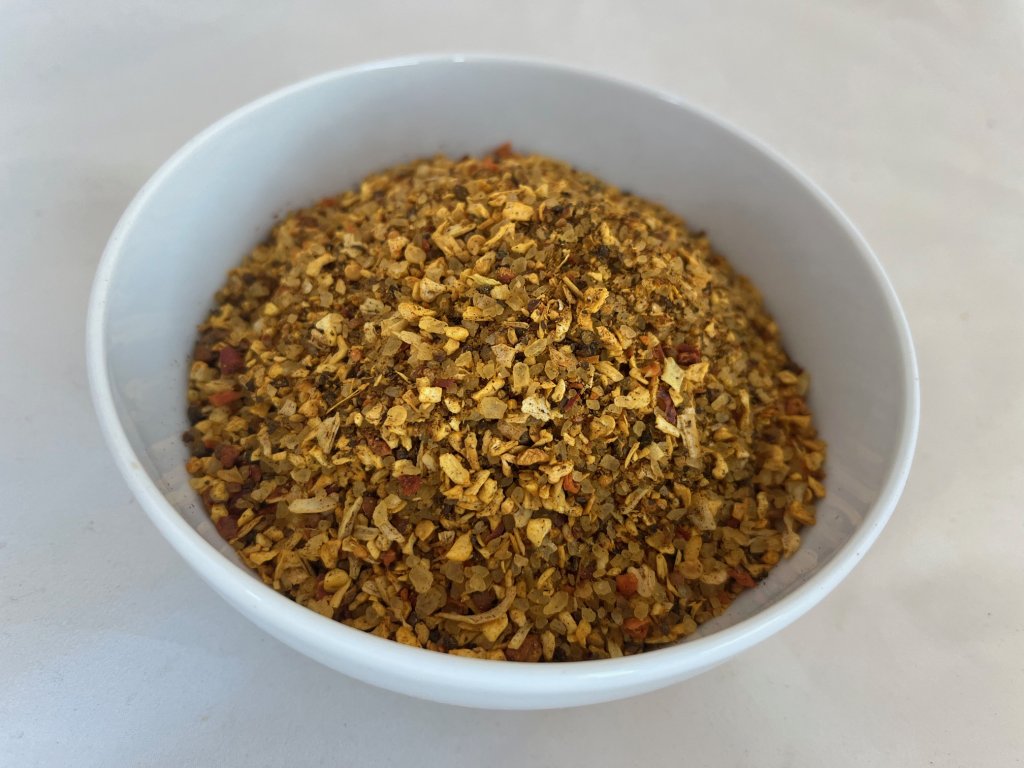 SLOŽENÍ: Sůl 59%, pepř černý, pastiňák, cibule, paprikové floky červené, česnek, chilli plátky, mrkev, kurkuma, olej řepkový, červená řepa, riboflavin.