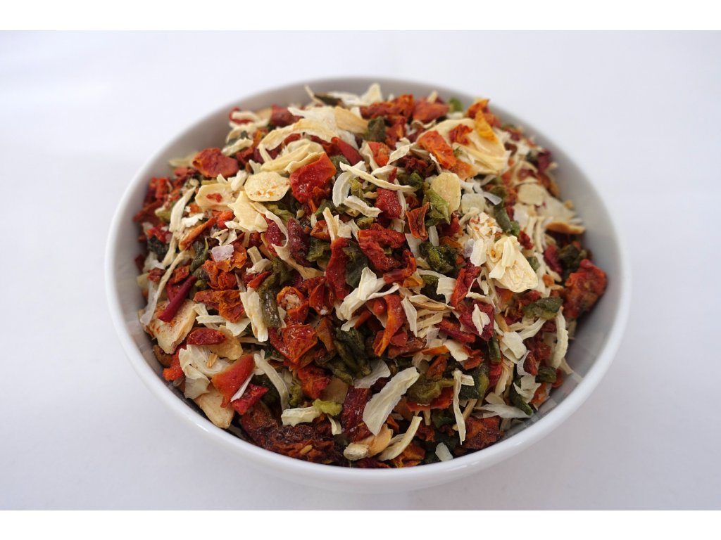 SLOŽENÍ: Cibule, česnek, rajčatové floky červené, paprikové floky červené, paprikové floky zelené.