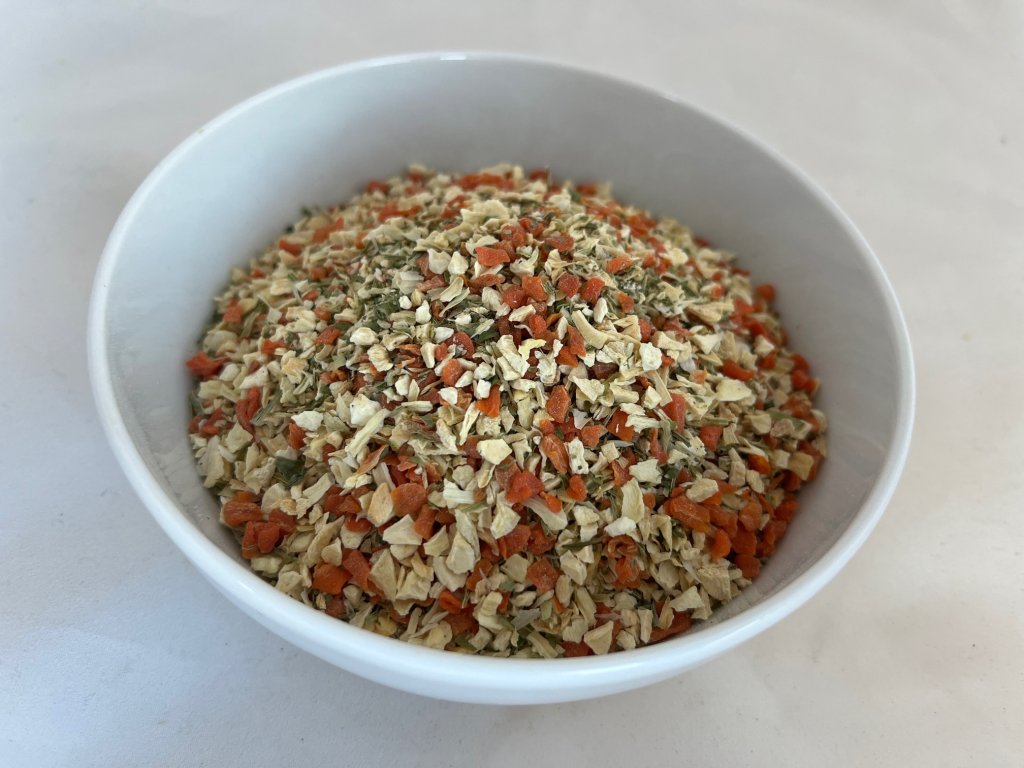 SLOŽENÍ: pastiňák sušený kostka, mrkev sušená granulovaná, cibule granulovaná, petrželová nať, pórek sušený, petržel sušená kostka, CELER sušený kostka